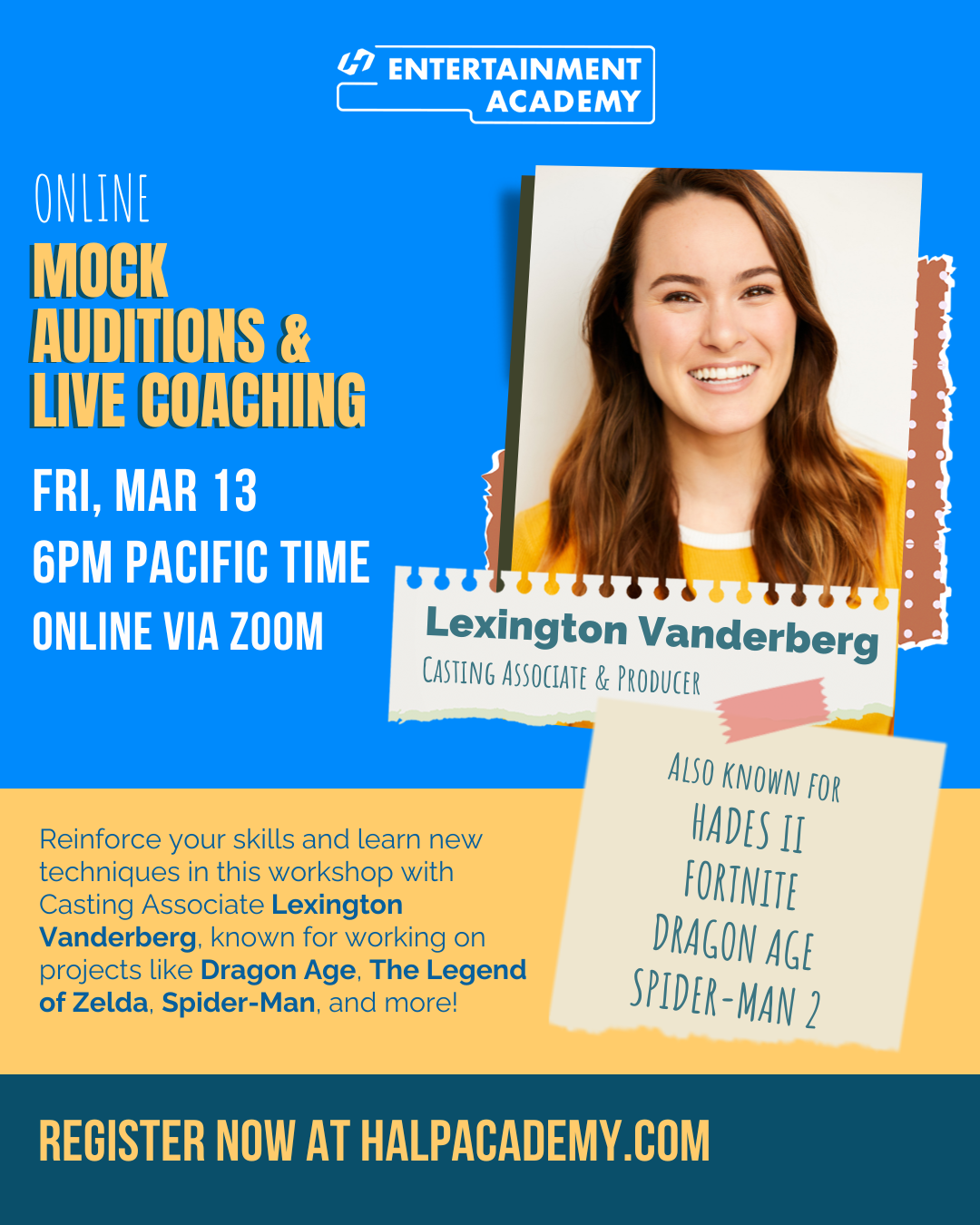 Reinforce your skills and learn new techniques in this workshop with Casting Associate Lexington Vanderberg, known for working on projects like Dragon Age, The Legend of Zelda, Spider-Man, and more!