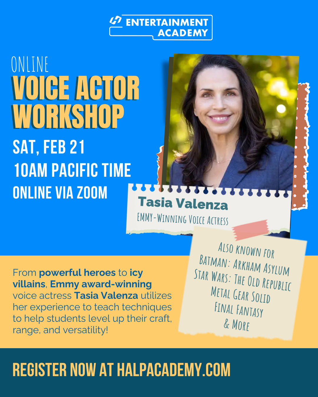 From powerful heroes to icy villains, EMMY Award-winning voice actress Tasia Valenza utilizes her experience to teach techniques to help students level up their craft, range, and versatility!